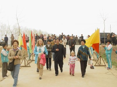 陆口小学临时由展览室改做的会议室里人声鼎沸。黑板前方悬挂的标语上醒目地揭示着今天会议的主题。到会的除了 64 位村民、老师以外,还有远道而来的志愿者 —— 南京农业大学社会系的 王泳 教授、中央电视台二台的徐寒梅记者以及惠黎基金会的工作人员。人多便显出屋子的拥挤来,大伙主动地将凳子与邻座靠一靠,整个会场上呈现出一种热情、友好的气氛。